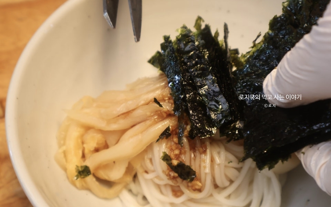 11. 간장국수 양념장을 올려주고, 조미김을 잘라서 올립니다. 깨를 뿌려 마무리해 줍니다.