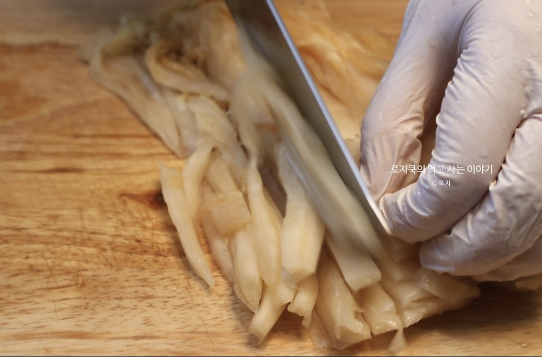 8. 물기를 꽉 짠 후, 길고 잘게 썰어서 준비합니다.