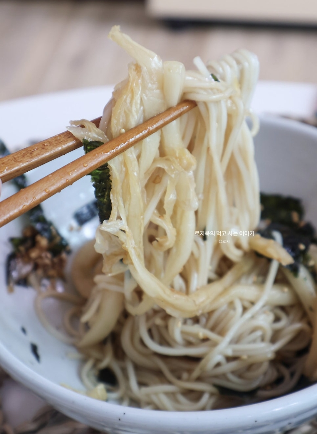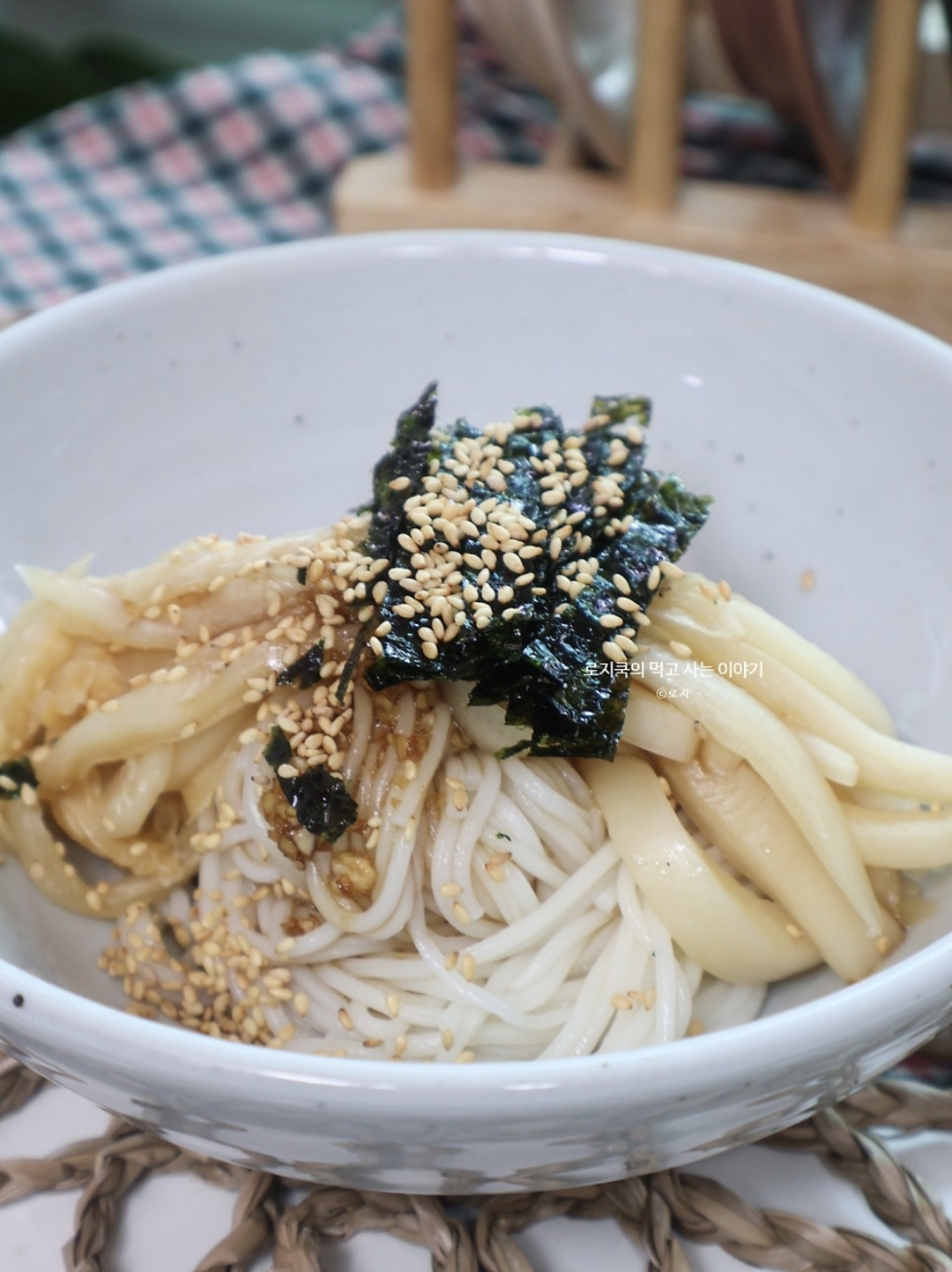 11. 간장국수 양념장을 올려주고, 조미김을 잘라서 올립니다. 깨를 뿌려 마무리해 줍니다.