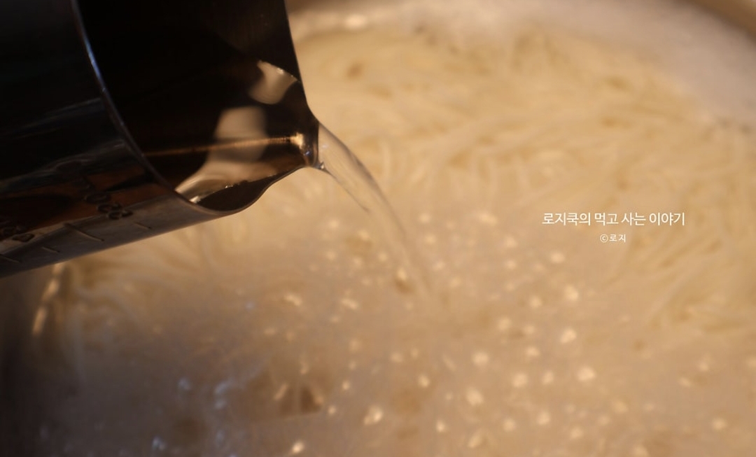 6. 중간에 찬물을 한번 부어줬습니다. 중간중간 휙휙 저어가며 삶아줍니다.
