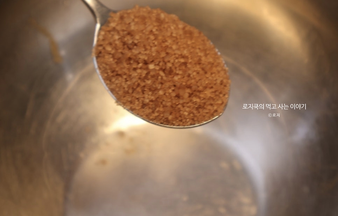 1. 설탕 2 큰 술을 넣어줍니다. 원래 레시피는 2 큰 술인데 제 입맛에는 좀 달아서 1 큰 술만 넣었습니다.