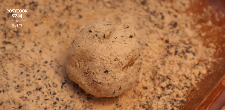 10. 9번에 라이스페이퍼로 감싼 감자를 굴려줍니다. 이렇게 해주시면 감자의 겉면을 표현할 수 있습니다.