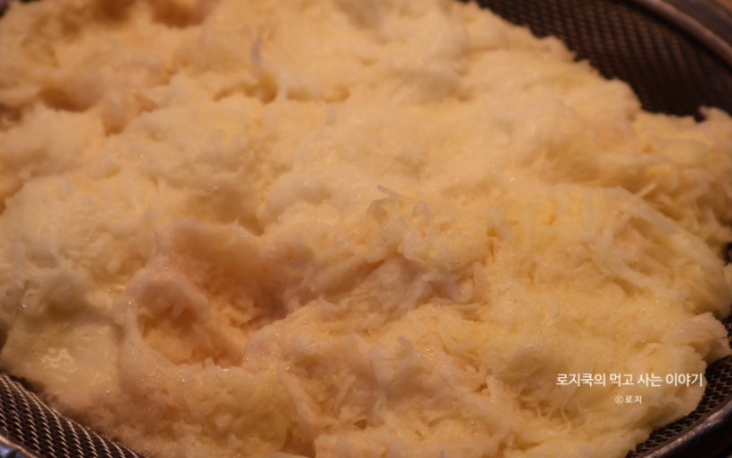 2. 체에 밭쳐 감자에서 나온 수분을 빼줍니다.