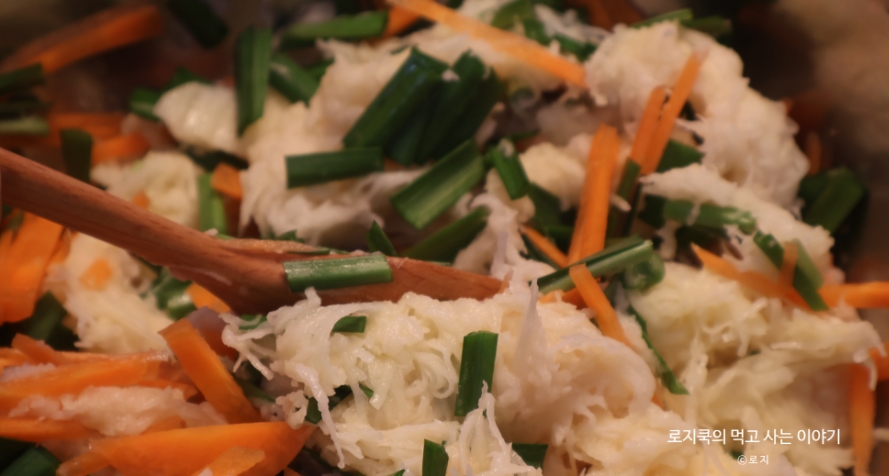 6. 썰어둔 당근, 부추도 넣고 함께 버무립니다.