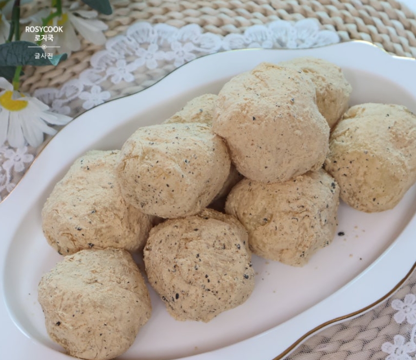 9. 검은깨를 곱게 빻아서 준비해 줍니다. 인절미 콩가루에 빻아둔 검은깨를 넣고 섞어줍니다.