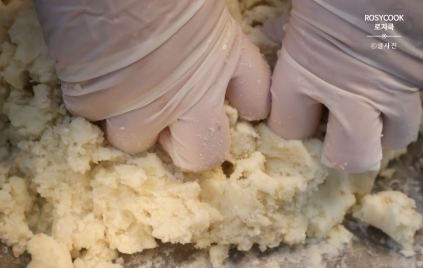 5. 전분의 양은 반죽하면서 조절하시면 됩니다. 질척이지 않게 뭉쳐질 정도로 넣어줍니다.