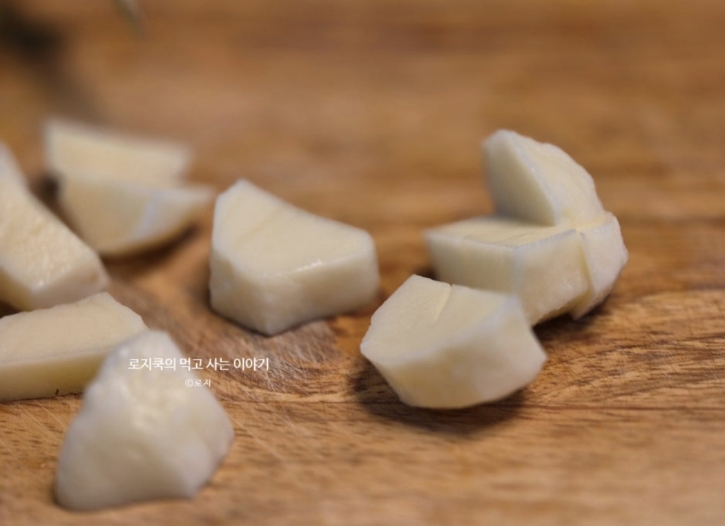 1. 껍질을 깐 감자 808g을 깍둑썰기 한 후, 찬물에 담가서 전분기를 빼줍니다.