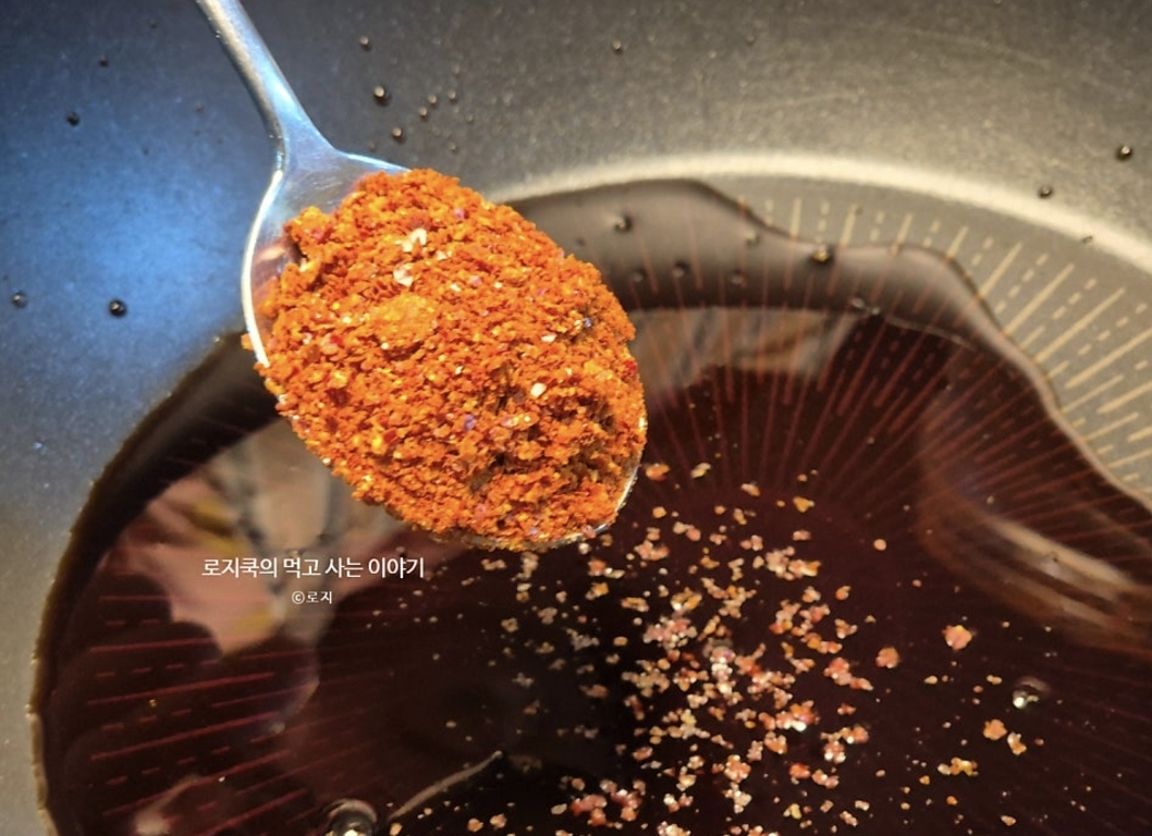3. 진간장 5 큰 술, 고춧가루 3 큰 술을 넣어줍니다.