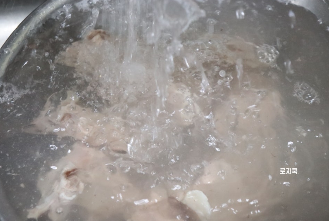 3. 겉면이 살짝 익은 등뼈를 흐르는 물에서 하나씩 세척합니다. 이렇게 해주시면 깔끔하게 끓일 수 있습니다. 세척한 등뼈를 솥에 담아줍니다.