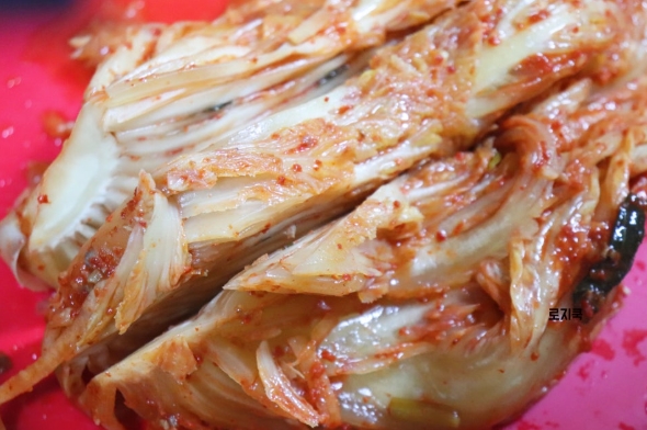 10. 고춧가루를 넣기 전에 김치를 먼저 넣어줍니다. 김치 속을 그대로 넣으면 깔끔하지 않기에 속을 제거 후 넣어줄겁니다. 통째로 넣어서 후에 잘라먹어도 되나, 넣을 때 4등분으로 길게 나눠줬고, 1/4쪽 사용했습니다.