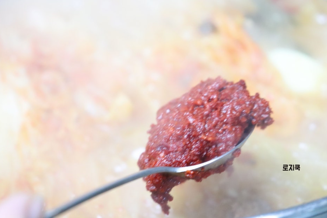 12. 만들어둔 고춧가루 다대기 양념을 풀어줍니다. 묵은지가 푹 익고, 감자가 익을 때까지 15분 ~ 20분 더 끓여주시고, 중간중간 기름이 뜨면 국자로 걷어내주시면 좋습니다.