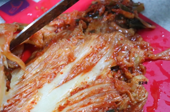 10. 고춧가루를 넣기 전에 김치를 먼저 넣어줍니다. 김치 속을 그대로 넣으면 깔끔하지 않기에 속을 제거 후 넣어줄겁니다. 통째로 넣어서 후에 잘라먹어도 되나, 넣을 때 4등분으로 길게 나눠줬고, 1/4쪽 사용했습니다.