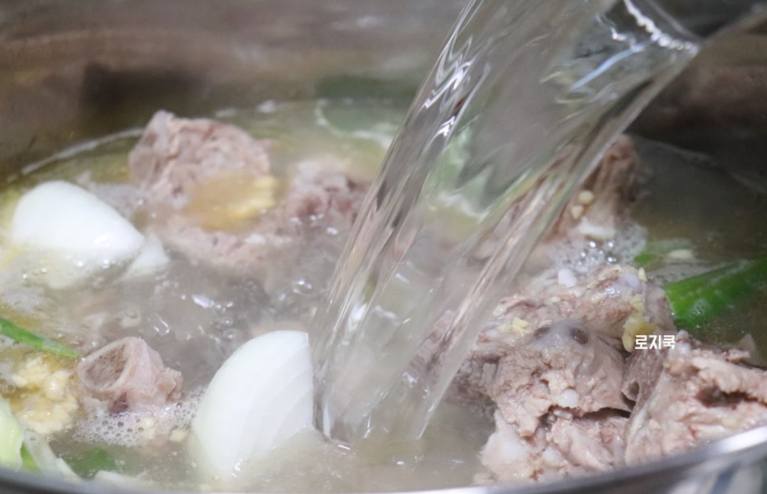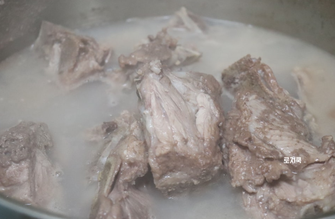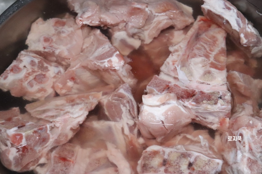 2. 담가뒀던 물을 모두 버리고 솥에 등뼈를 담고 잠길 정도로 물을 부어줍니다. 고기 겉면이 살짝 익을 때까지만 삶아줍니다.