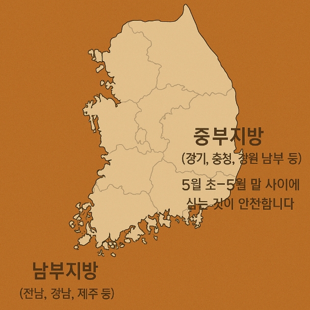 ▶ 보통 4월 중순~5월 초에 심는 것이 적기입니다. 남부는 기온 상승이 빠르기 때문에 4월 중순에도 토양 온도가 충분히 올라갑니다. - 중부지방(경기, 충청, 강원 남부 등)