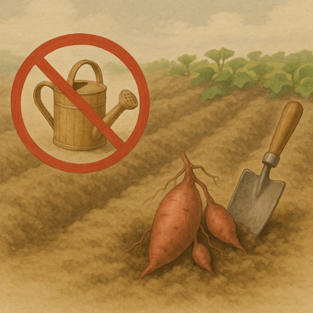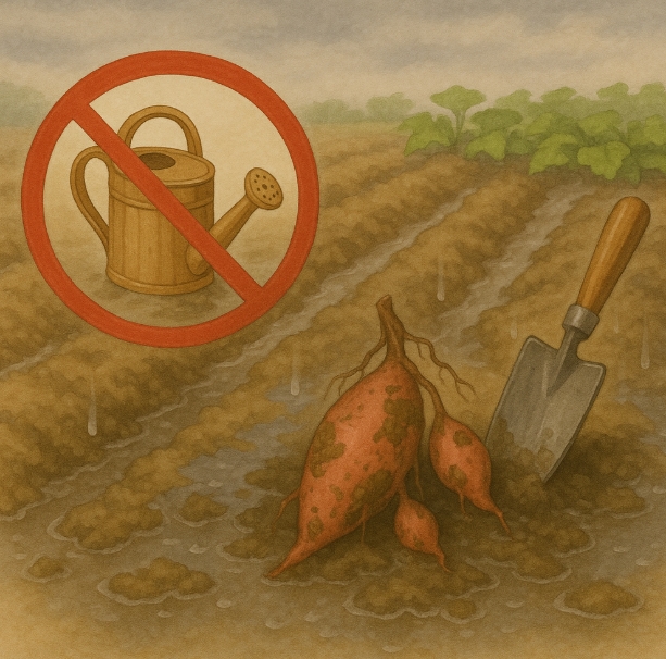 - 비 온 직후 수확은 피해야 합니다. 땅이 질척하면 고구마 표면이 손상되고 보관이 어렵습니다.