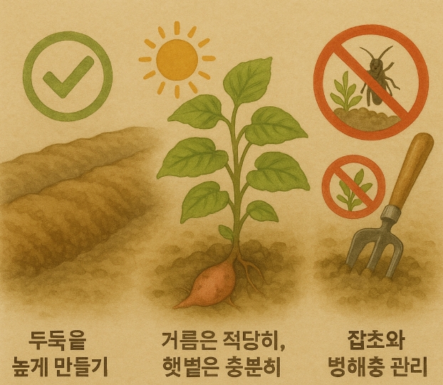 고구마는 땅속에서 자라는 만큼 이랑을 높게 만들면 더 깊고 굵게 자랍니다. 배수에도 유리하죠. - 거름은 적당히, 햇볕은 충분히