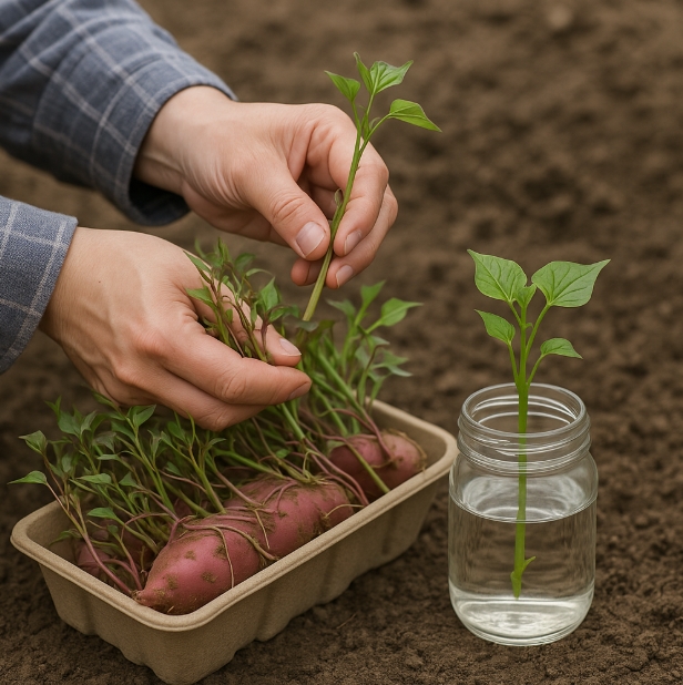 3월 말~4월 초부터 고구마 순을 준비하거나 구매합니다. 이때 고구마 줄기에서 새순을 잘라 물이나 흙에 꽂아 모종으로 길러냅니다. - 중부지방