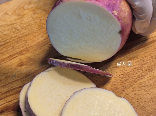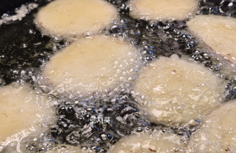 그다음 0.5cm~0.7cm 정도 두께로 썰어줍니다. 두께가 일정해야 속까지 골고루 익고 튀겼을 때 식감도 균일하답니다. 너무 얇으면 쉽게 부서지고, 너무 두꺼우면 속이 익지 않으니 주의하세요.