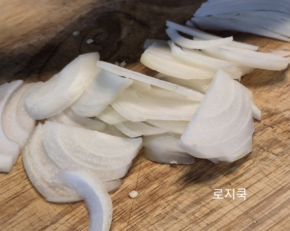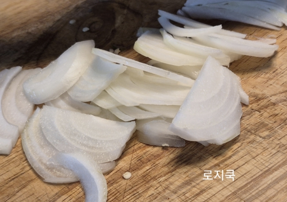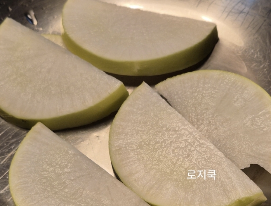 무는 반달 모양으로 썰어 냄비 바닥에 깔아줄 거예요.