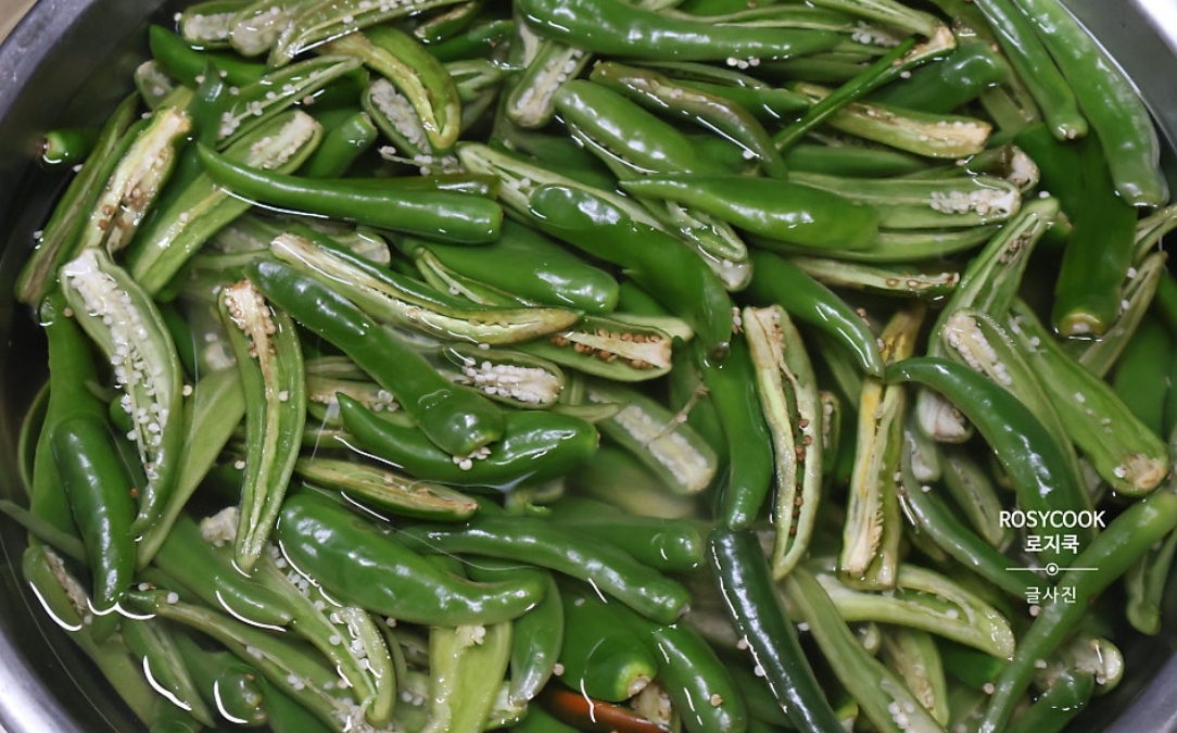 1. 고추를 식초를 희석한 물에 10분 ~ 15분 정도 담가둡니다. 흐르는 물에서 헹궈서 준비해 줍니다.