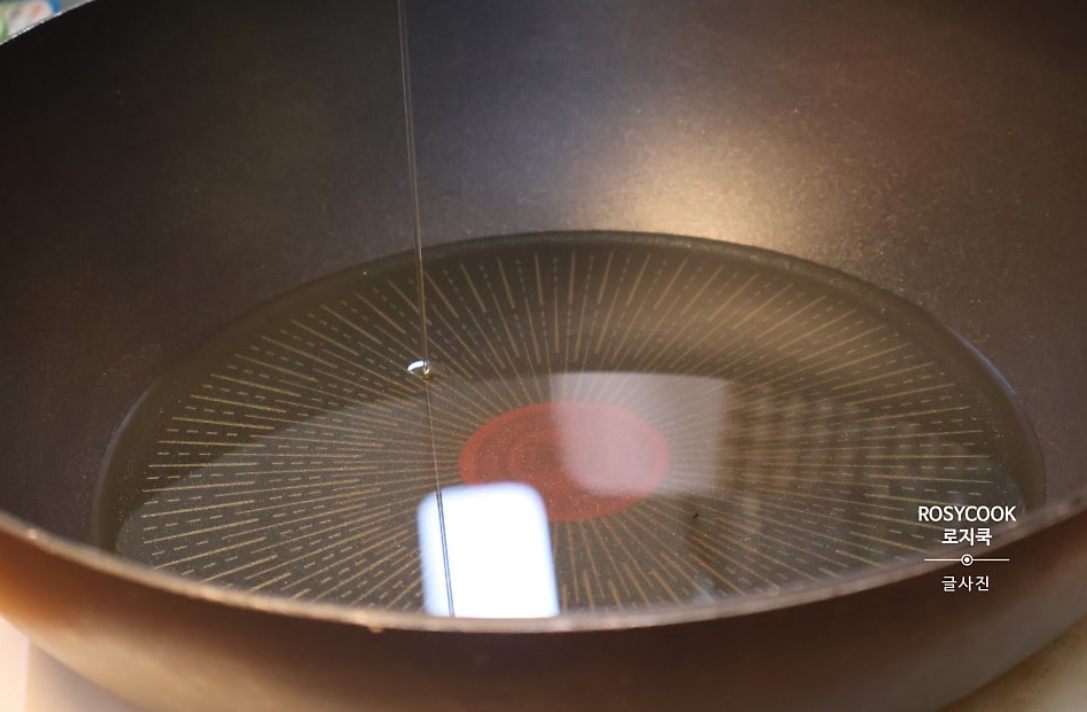 1. 식용유를 팬에 넉넉하게 둘러준 후, 예열해줍니다. 170도 ~ 180도 정도에서 튀겨주시면 됩니다. 고추부각을 넣었을 때 지글지글 끓어오르면 적정 온도가 된 것입니다.