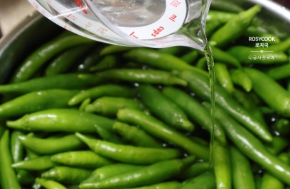 2. 청양고추를 물에 담가주시고, 식초를 살짝 넣어줍니다. 20분 정도 담가둡니다.