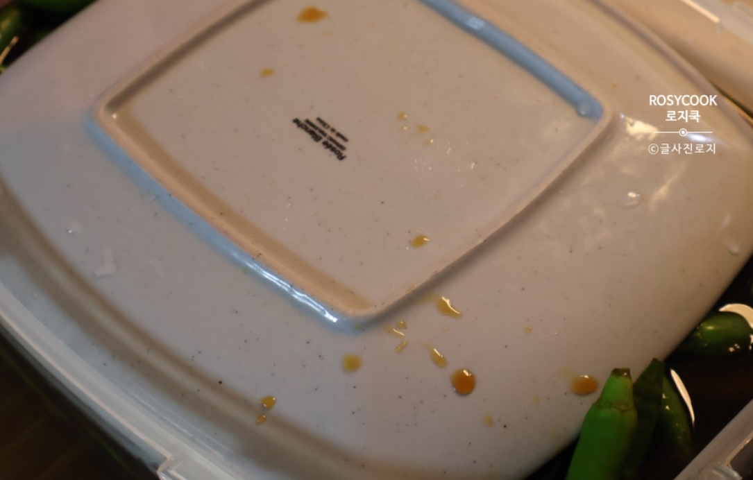 10. 고추가 끝까지 잠기도록 그릇을 누른 후, 덮어줍니다. 실온에서 1 ~ 2일 정도 보관 후, 냉장 보관해 줍니다. 전체적으로 노르스름해지면 드시면 됩니다. 일주일 정도면 어느 정도 숙성이 됩니다.