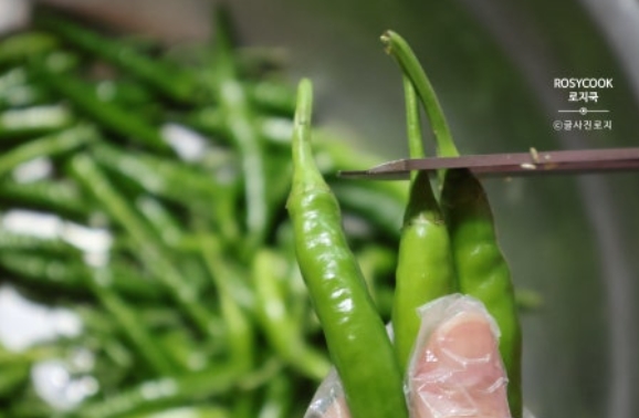 1. 청양고추의 꼭지를 완전히 제거하지 않고 끝만 가위로 다듬어줍니다.