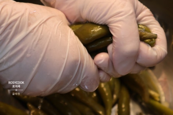 19. 준비해둔 양념에 삭힌고추를 넣고 잘 버무려줍니다.