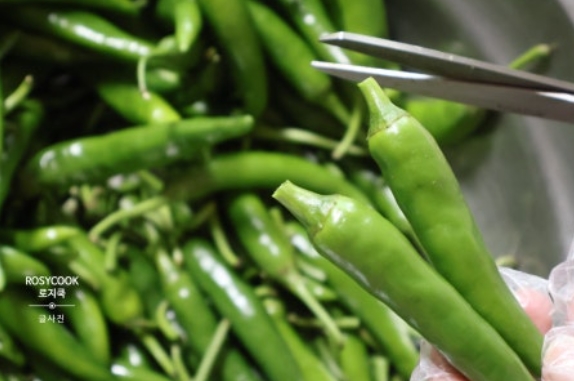 1. 고추 꼭지 끝을 가위로 잘라서 정리해 줍니다.
