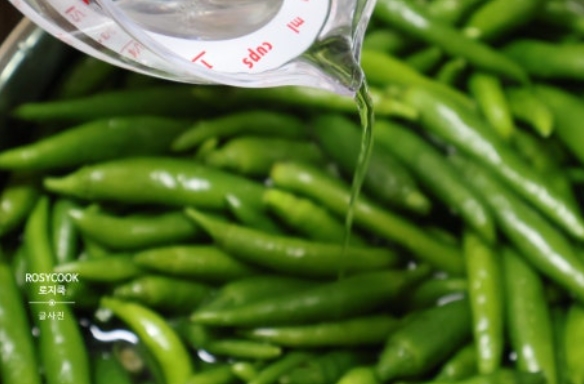 8. 소금물을 어느 정도 식혀준 후, 준비해둔 고추에 부어줍니다.