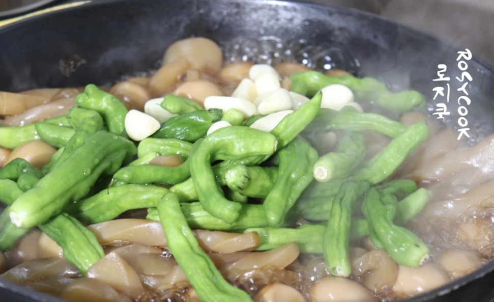 국물이 어느 정도 졸아들면 마늘, 꽈리고추 순으로 넣어줍니다.