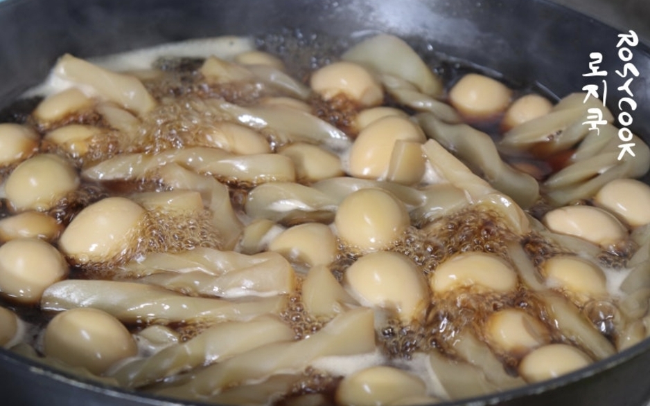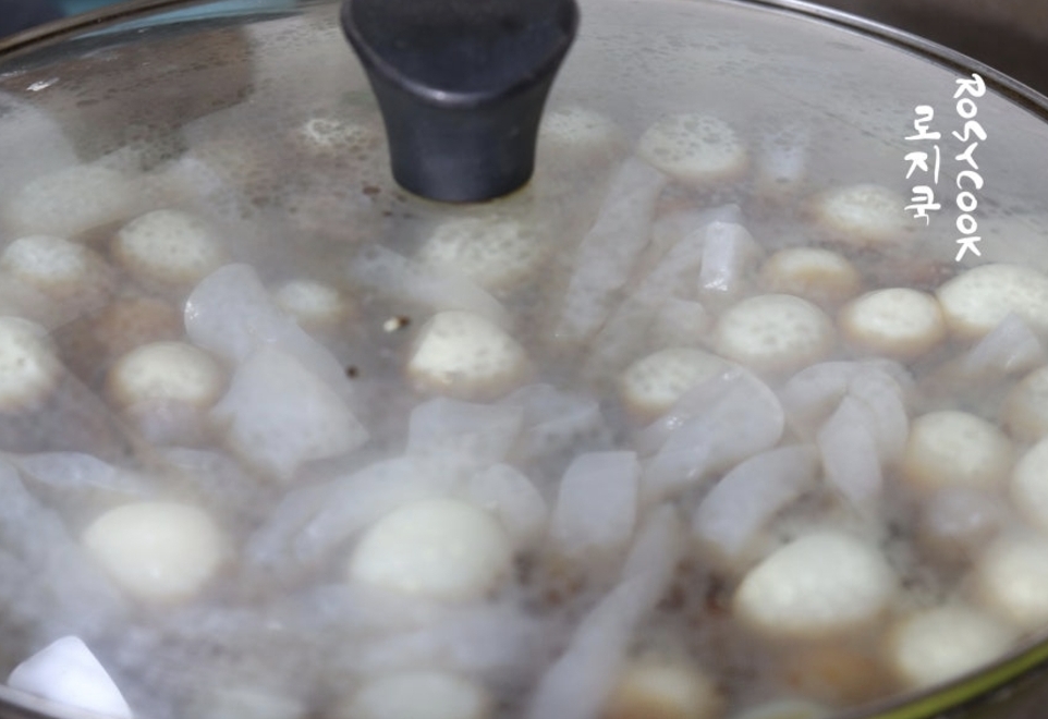 진간장을 넣고 뚜껑을 덮은 채 끓이다가 설탕을 넣고 중불에서 조려주세요.