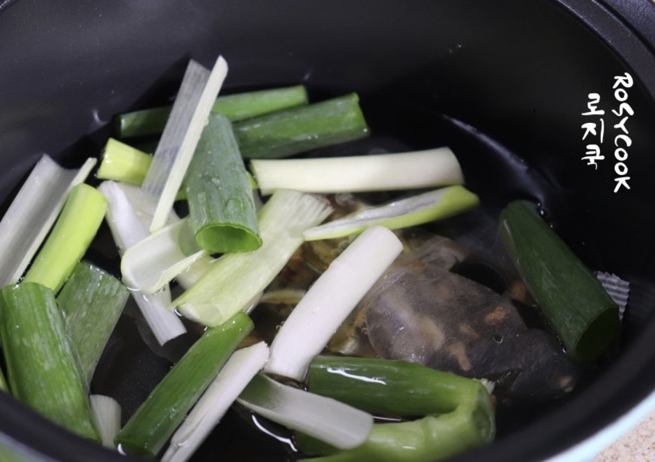 물 1L에 다시팩과 큼직하게 썬 대파를 넣고 15~20분간 끓인 뒤 체에 걸러 준비합니다.