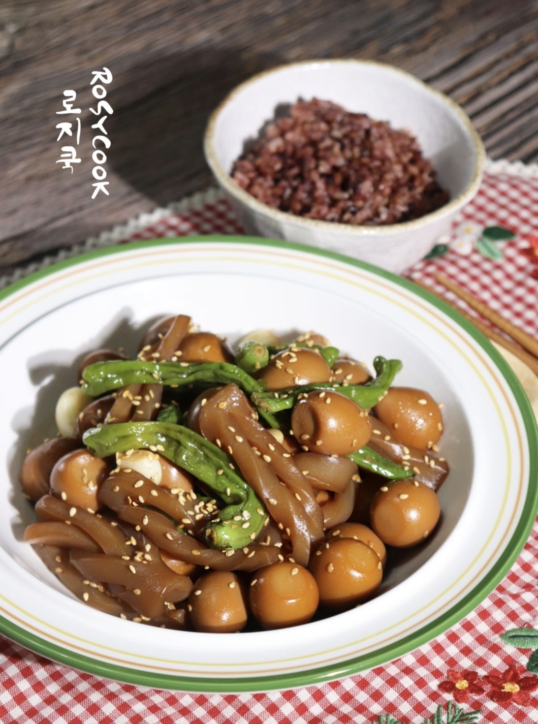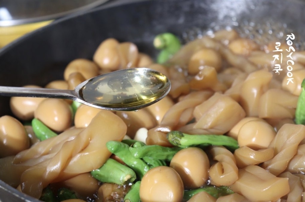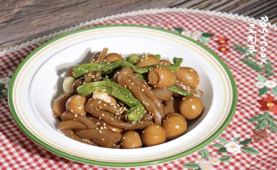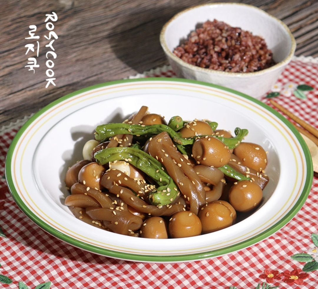 곤약 특유의 식감과 메추리알의 부드러움, 꽈리고추의 매콤함이 어우러져 밥도둑처럼 자꾸 손이 가는 반찬이에요.