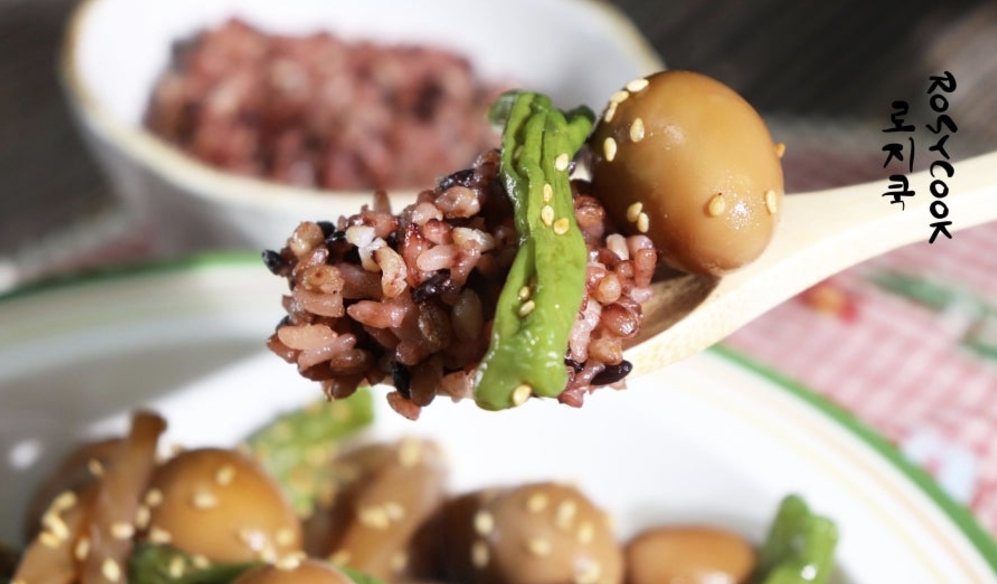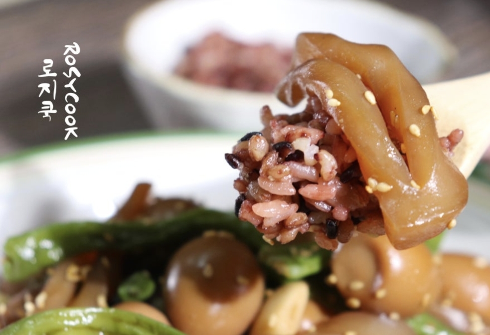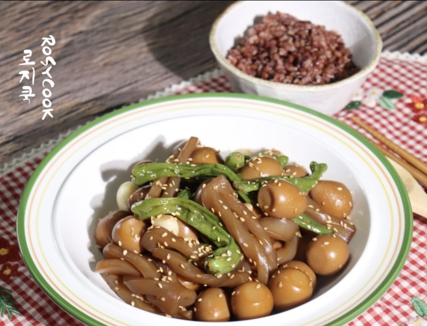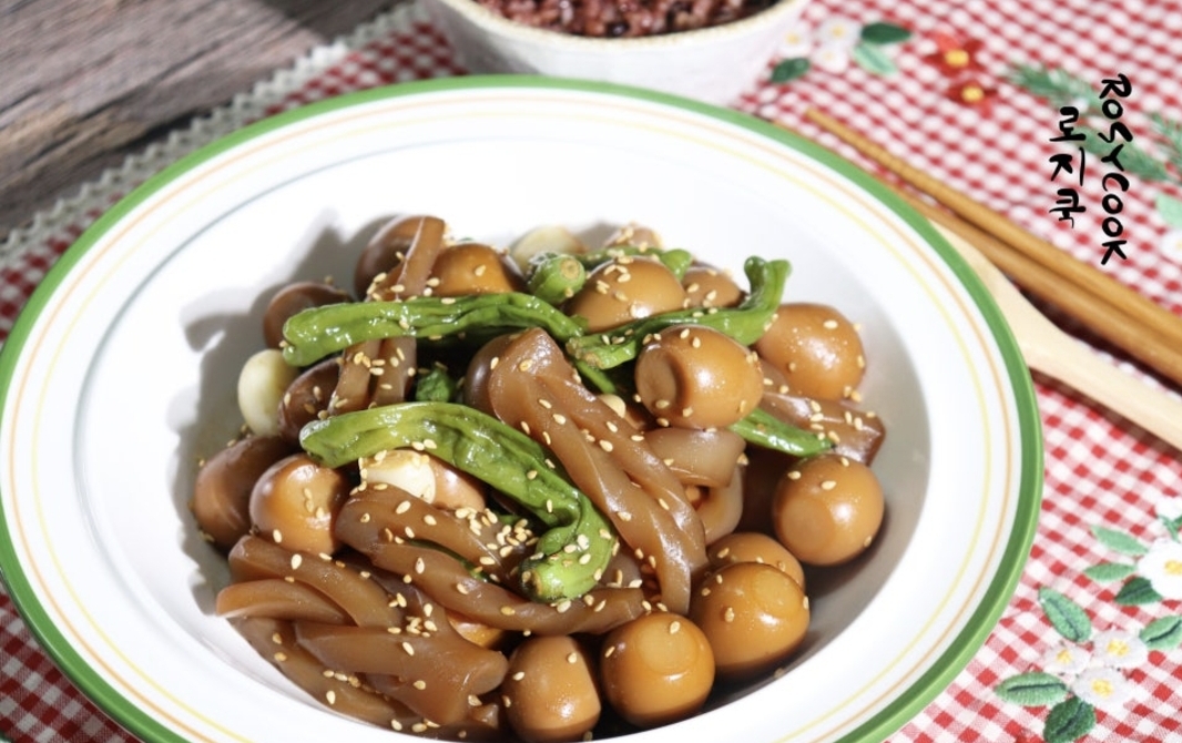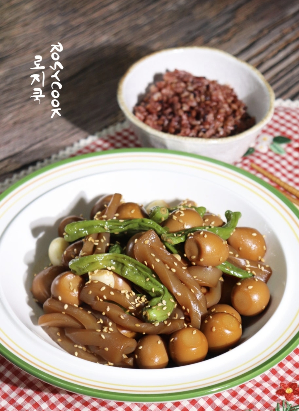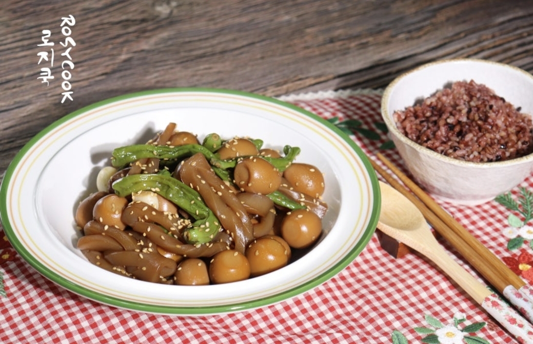 곤약 특유의 식감과 메추리알의 부드러움, 꽈리고추의 매콤함이 어우러져 밥도둑처럼 자꾸 손이 가는 반찬이에요.