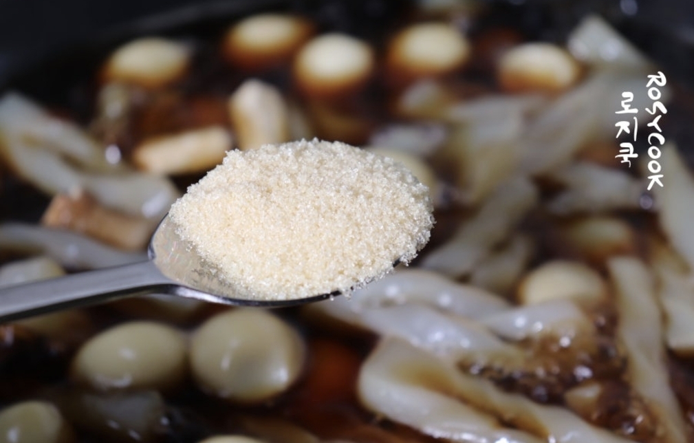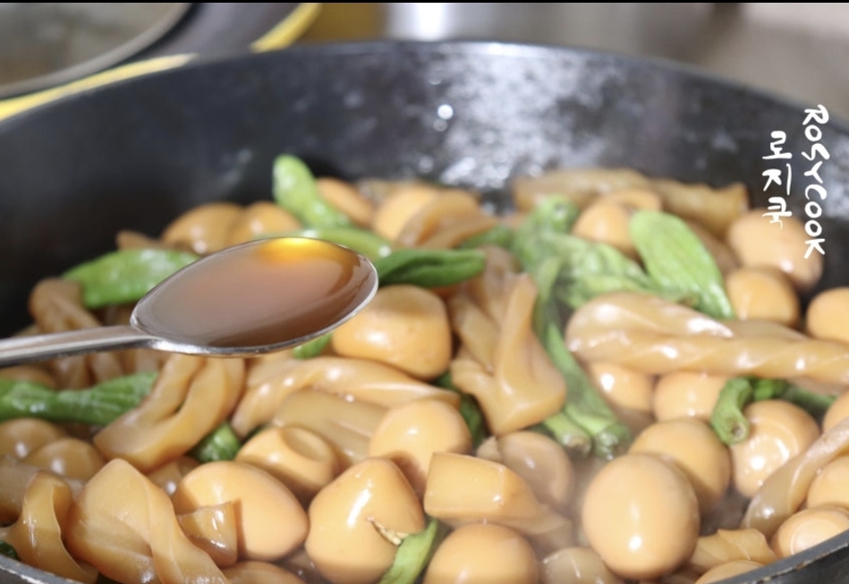 진간장을 넣고 뚜껑을 덮은 채 끓이다가 설탕을 넣고 중불에서 조려주세요.