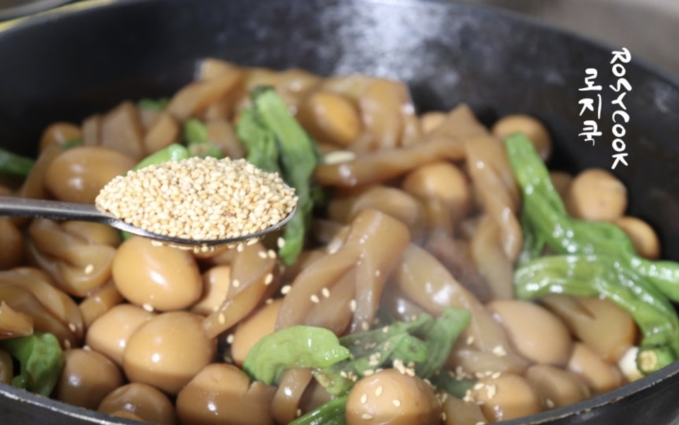 마지막으로 올리고당, 참기름, 참깨를 넣고 한소끔 더 끓여 마무리하면 메추리알 곤약장조림 완성!