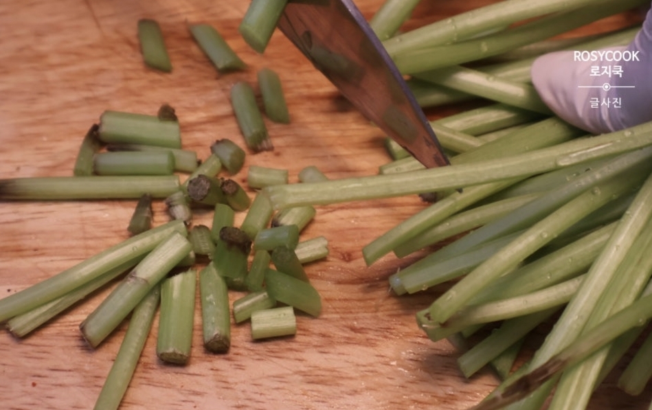 곰취는 흐르는 물에 깨끗이 씻은 뒤, 줄기 끝부분을 잘라내고 큼직하게 썰어 준비합니다.