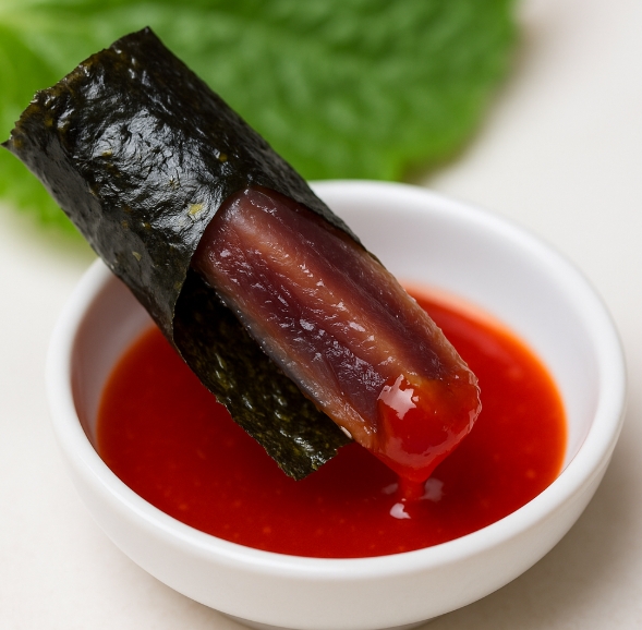 고소하게 구운 김 한 장 위에 과메기를 올리고 초장이나 마늘 한 점만 곁들이면, 과메기 특유의 풍미가 김의 구수함과 만나 훨씬 깊은 맛을 냅니다. 세트로 싸먹는 느낌이라 부담 없이 즐길 수 있고, 특히 과메기 초보자들에게 “이렇게 먹으면 실패 없다”는 평가를 받는 조합입니다.