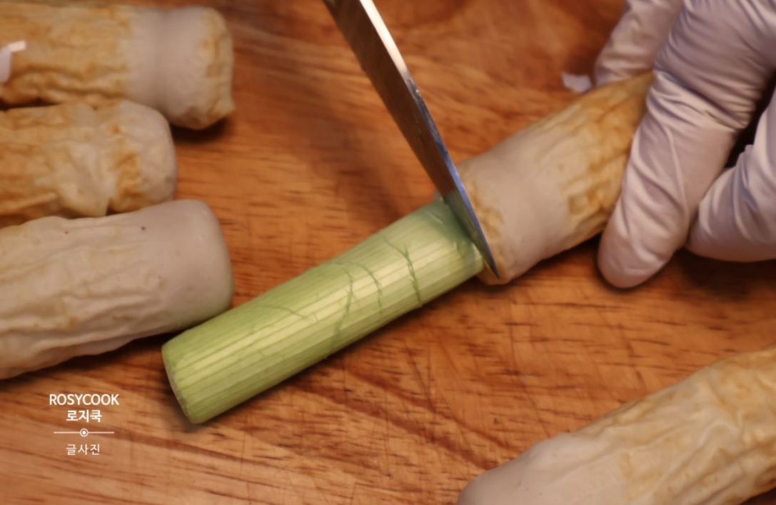 1. 먼저 대파를 어묵 길이에 맞게 썰어줍니다.