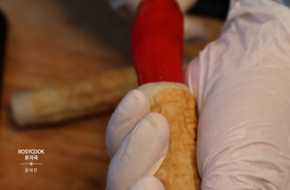 3. 홍고추의 꼭지를 따서 넣어주시고, 마찬가지로 끝까지 잘 안 들어가면 남은 부분은 썰어서 반대쪽으로 집어넣으시면 됩니다.