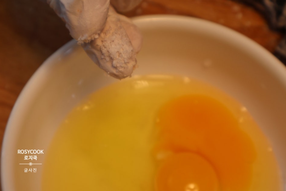7. 계란 3알에 소금 1 꼬집을 넣어줍니다. 잘 풀어주시고, 부침가루를 입힌 어묵을 담가서 계란을 잘 입혀줍니다.