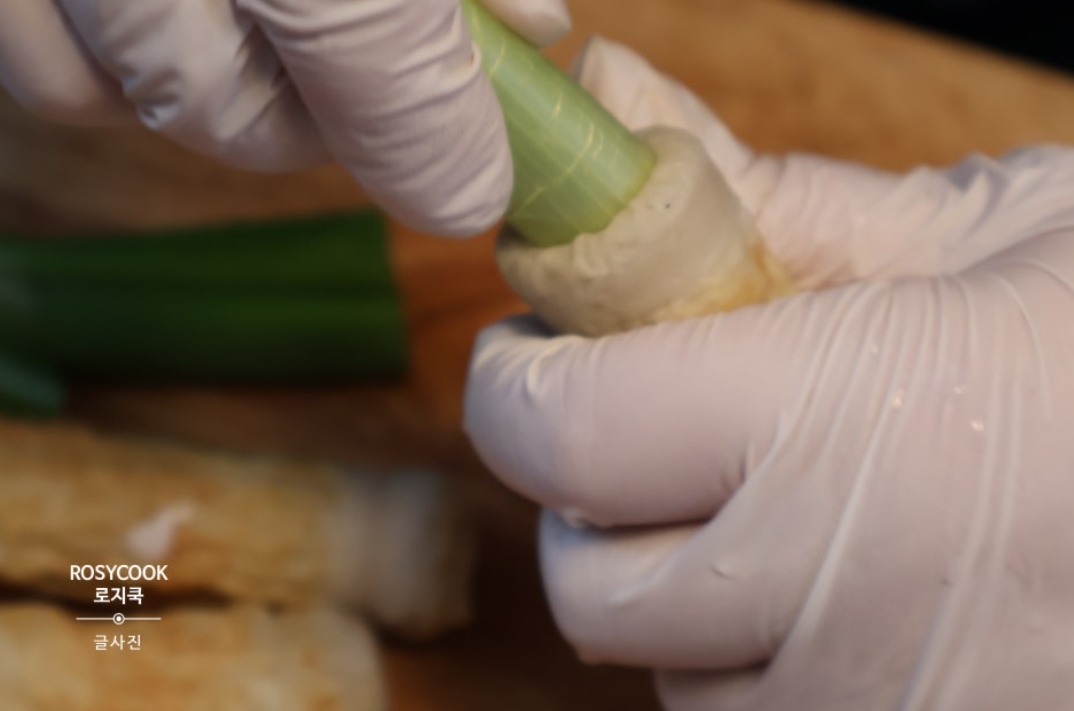 2. 대파를 끼워 넣어줍니다. 한 번에 집어넣으러고 하면 뻑뻑해서 잘 안 들어가니 참고하시길 바랍니다. 이럴 땐 남은 대파를 썰어주고, 반대쪽으로 다시 넣어주시면 됩니다.