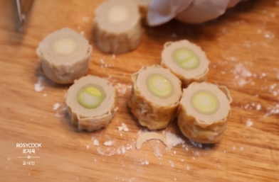 2. 대파를 끼워 넣어줍니다. 한 번에 집어넣으러고 하면 뻑뻑해서 잘 안 들어가니 참고하시길 바랍니다. 이럴 땐 남은 대파를 썰어주고, 반대쪽으로 다시 넣어주시면 됩니다.