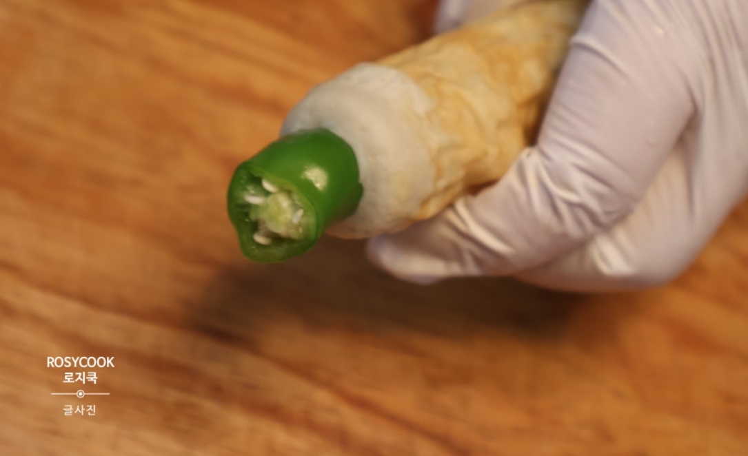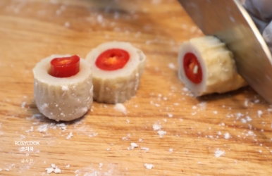 3. 홍고추의 꼭지를 따서 넣어주시고, 마찬가지로 끝까지 잘 안 들어가면 남은 부분은 썰어서 반대쪽으로 집어넣으시면 됩니다.