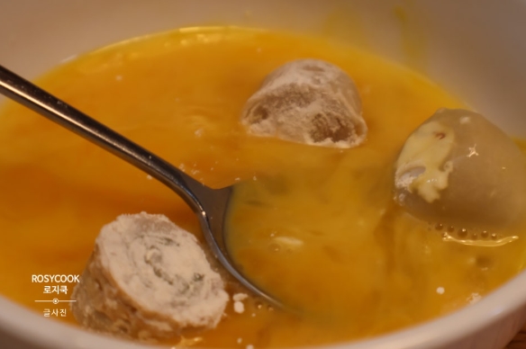 7. 계란 3알에 소금 1 꼬집을 넣어줍니다. 잘 풀어주시고, 부침가루를 입힌 어묵을 담가서 계란을 잘 입혀줍니다.