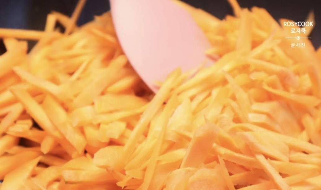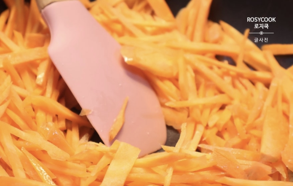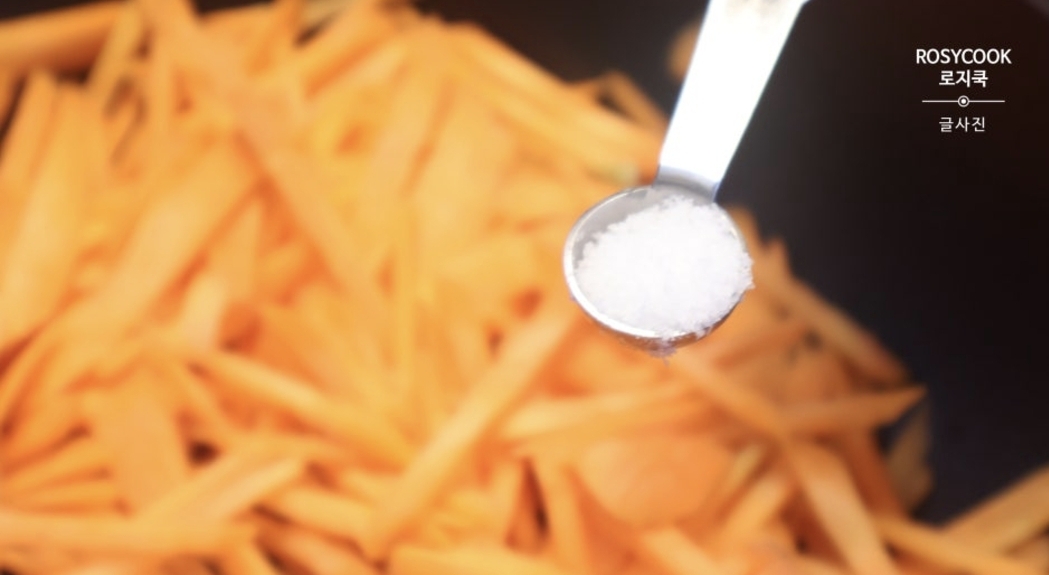 채 썬 당근 3개 (식용유를 살짝 두르고 소금 1/4티스푼과 함께 볶아줍니다)