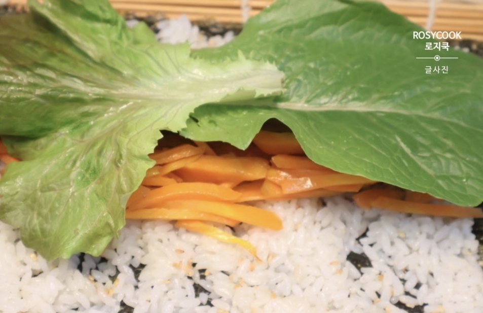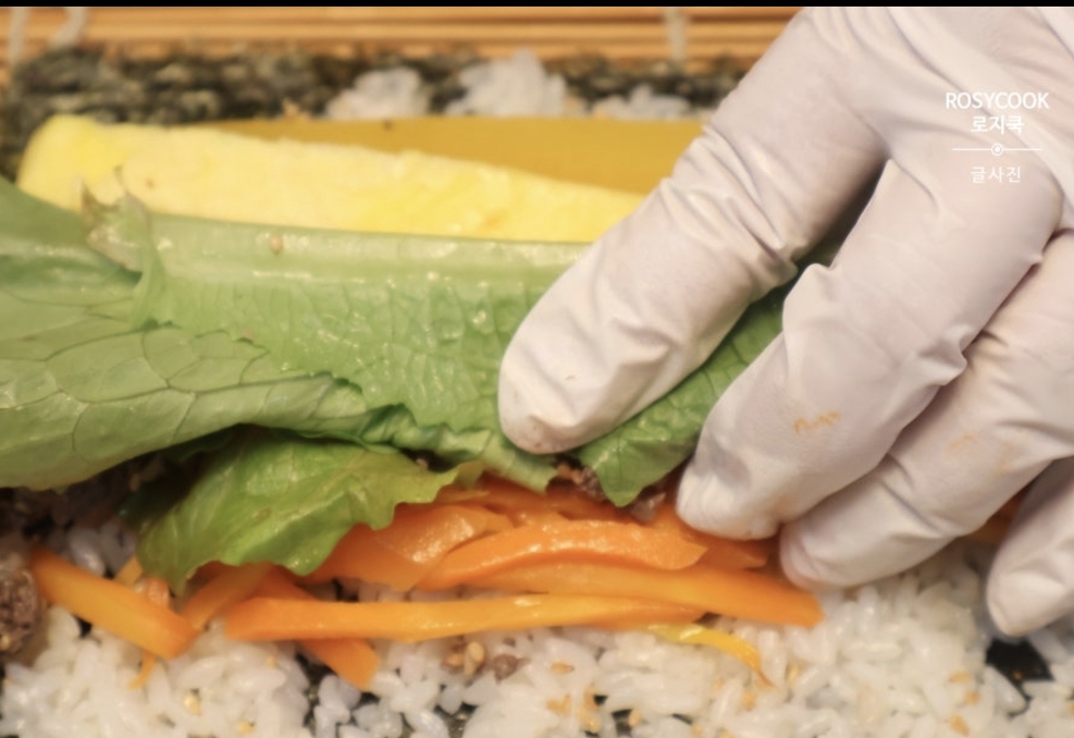 그 위에 단무지, 맛살, 햄, 우엉조림, 계란지단, 볶은 당근을 올리고요. 상추 2장을 겹쳐 올린 후, 그 위에 볶아둔 불고기를 살짝 올립니다.