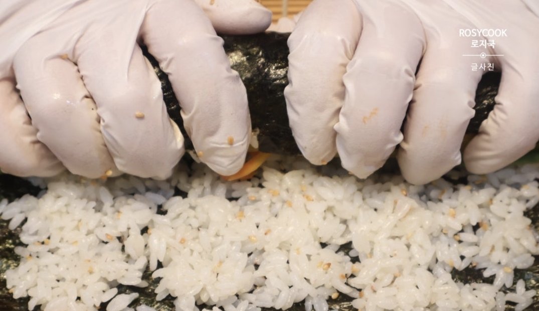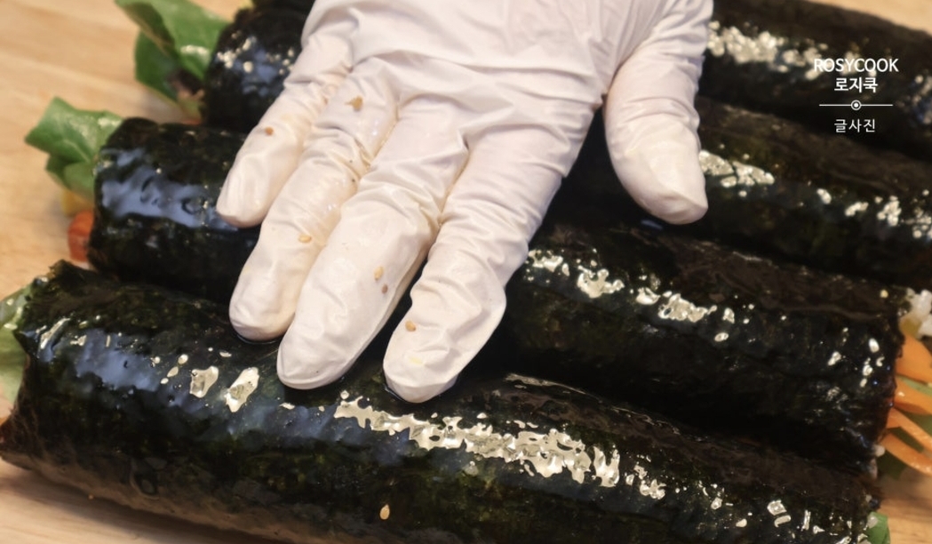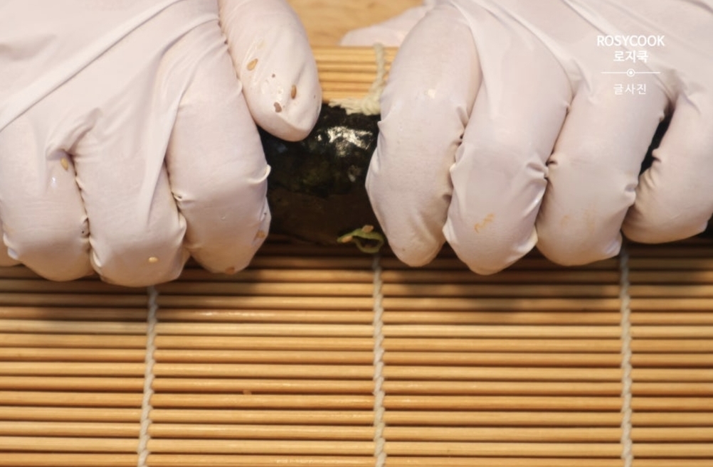 그리고 김밥을 단단히 말고, 김발로 꾹 눌러가며 고정해 주세요. 마지막에 참기름을 겉면에 발라주고 깨를 솔솔 뿌려 마무리하면 보기에도 먹음직스러워요.